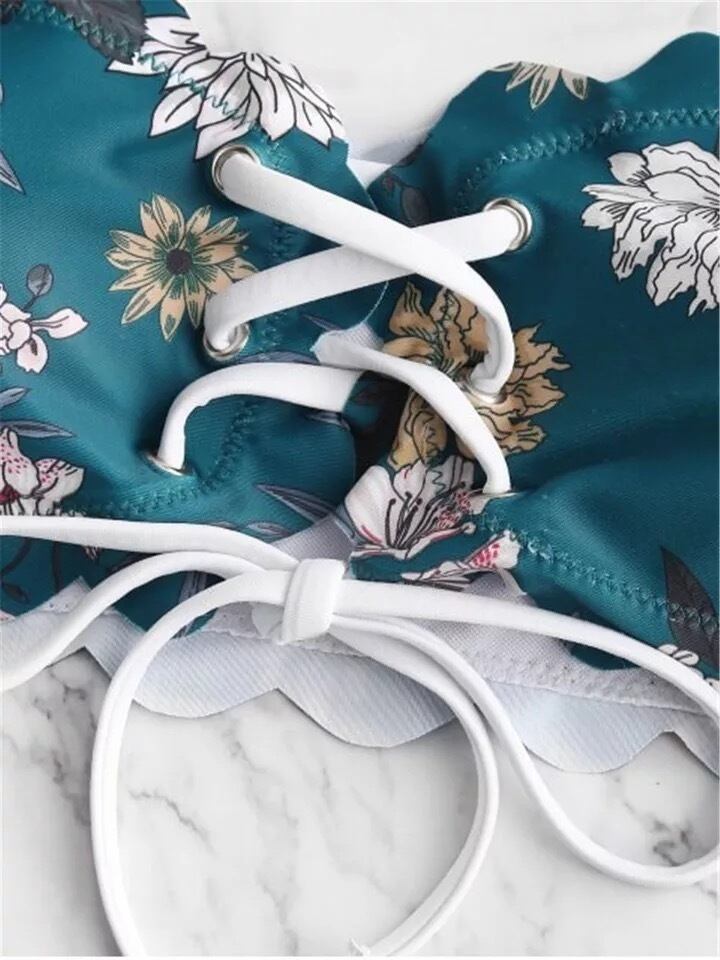 ♡送料無料♡インポート ボタニカル柄 スカラップバンドゥレースアップビキニ Blue Green B-30