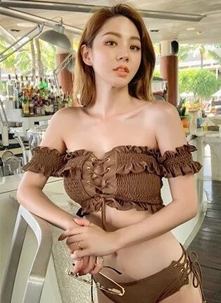 ♡送料無料♡オフショルダーギャザービキニ レースアップ 韓国 brown B-204