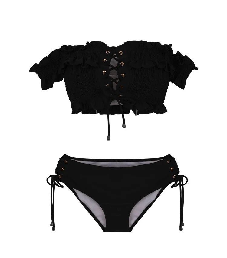 ♡送料無料♡オフショルダーギャザービキニ レースアップ 韓国 BLACK B-205